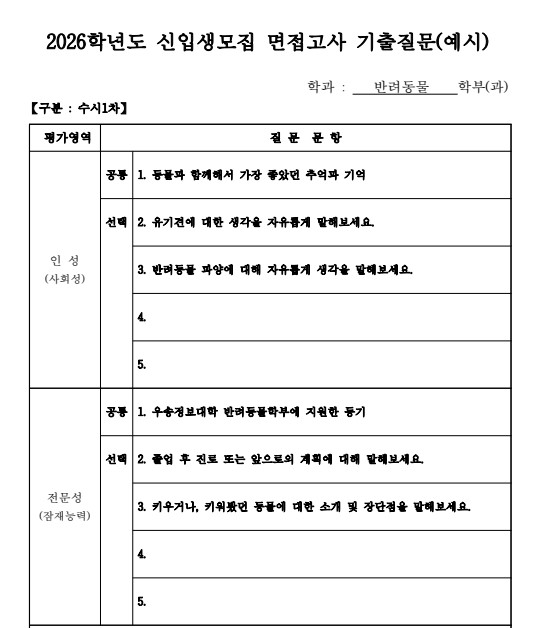 커뮤니티 공지사항 취업도우미 포토갤러리 동영상갤러리 관련사이트 동문현황 Home커뮤니티공지사항 공지사항 2026학년도 반려동물학부 수시1차 면접 예상질문 카테고리 : | 작성자 : 학과관리자 | 작성일 : 2025.09.24 | 조회수 : 45 22026학년도 반려동물학부 수시1차 면접 예상질문 공유합니다. 첨부파일 반려동물학부 면접 기출질문.jpg 목록